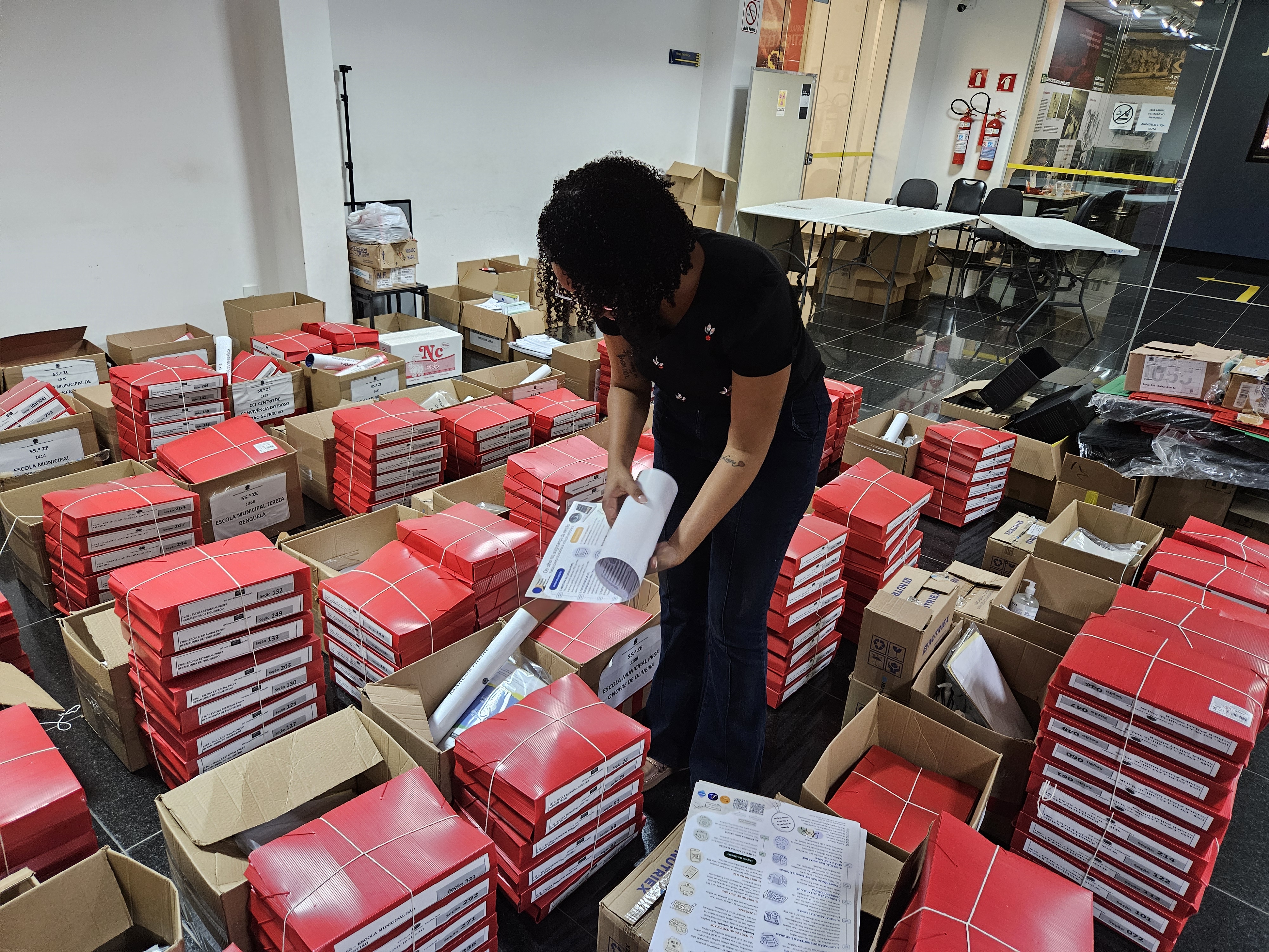 #PraTodosVerem: Foto que mostra, em destaque, o folder com o conteúdo da votação eletrônica em linguagem simples, nas mãos de uma mulher, que aparece, em segundo plano desfocado, lendo o folder. Atrás dela, tem um mural com alguns recados afixados e um adorno de lâmpada acesa, também desfocados.
