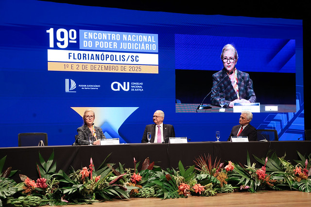 Na abertura do 19º Encontro Nacional do Poder Judiciário, na noite desta segunda-feira (1º/12), participantes acompanharam duas palestras magnas que abriram os debates do primeiro dia do evento com análises sobre a trajetória recente do sistema de justiça e os desafios que moldarão as próximas décadas. O 19º ENPJ reúne presidentes de tribunais, magistrados, magistradas, pesquisadores, pesquisadoras, gestores e gestoras de todo o país.