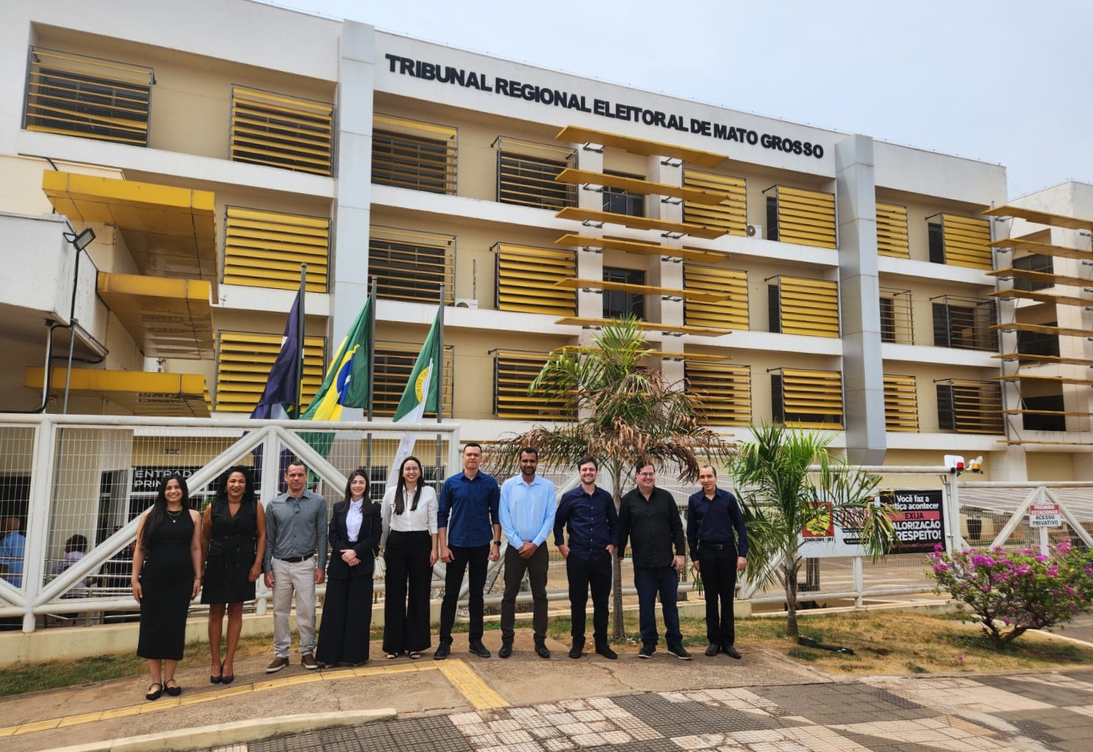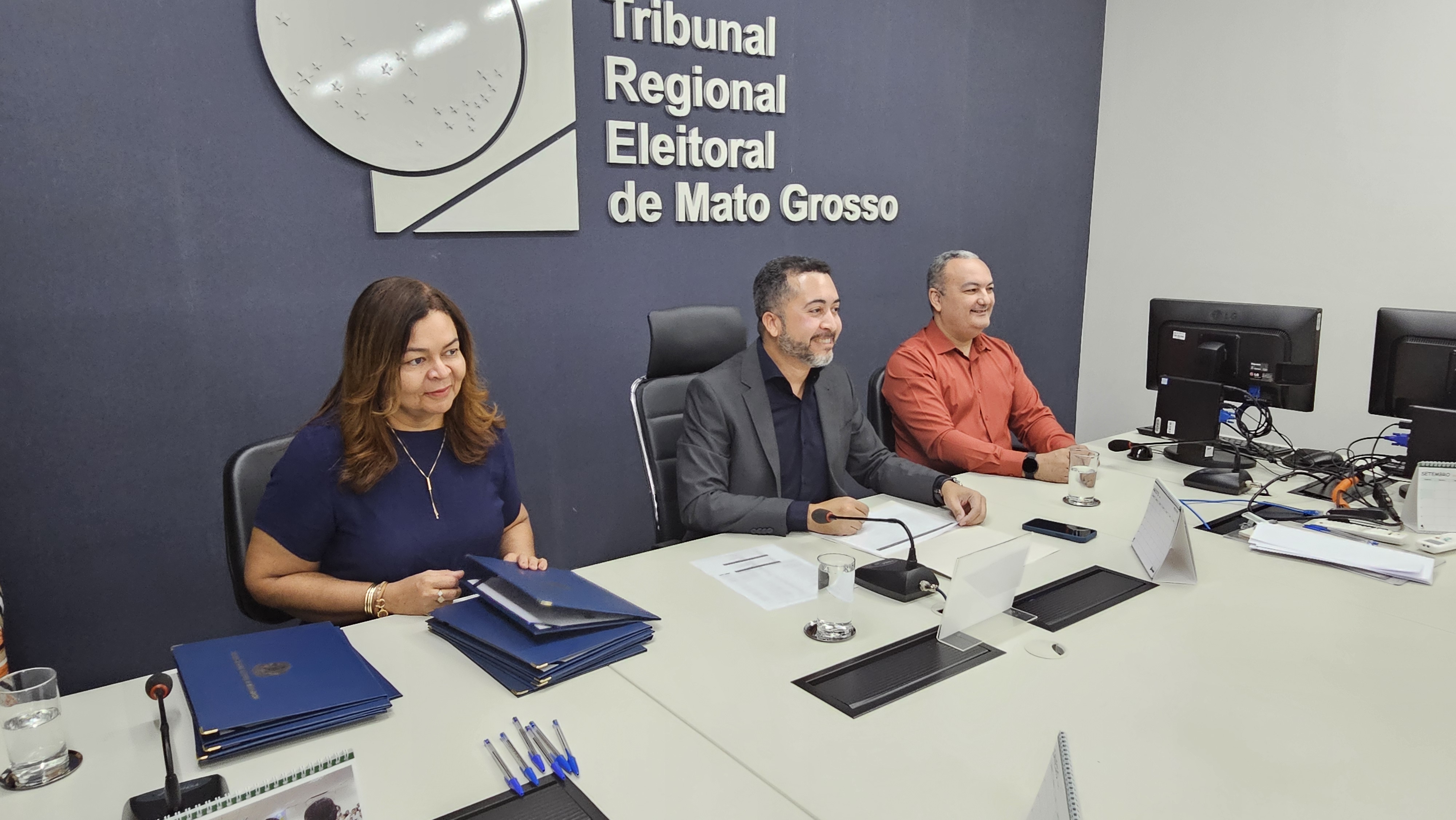 #PraTodosVerem: A imagem mostra uma reunião formal na sede do TRE-MT. Dez pessoas estão sentadas ao redor de uma mesa de reuniões, enquanto outros três integrantes da instituição acompanham a cerimônia. Ao fundo, aparecem as bandeiras do Brasil e de Mato Grosso, além do logotipo do TRE-MT na parede. Trata-se de um momento oficial, ligado à posse de novos servidores. Ao final da matéria, tem uma galeria com mais fotos do evento.