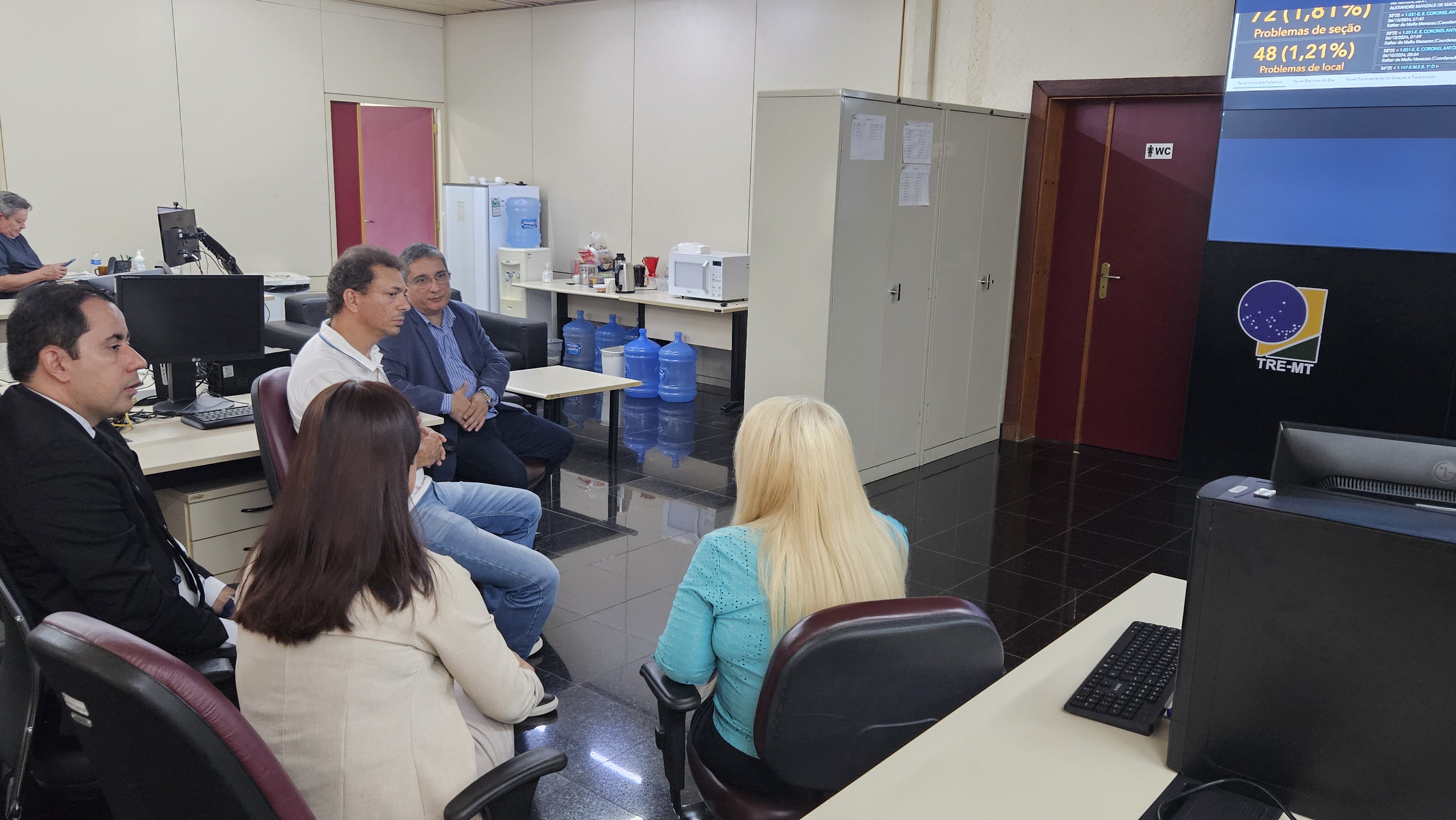 #PraTodosVerem: A imagem mostra uma sala do TRE-MT, com um grande painel digital exibindo um mapa de Mato Grosso e diversos pontos de informação. Servidores e gestores estão sentados em cadeiras e estações de trabalho, acompanhando os dados na tela e participando de uma reunião técnica, em um ambiente moderno e organizado.