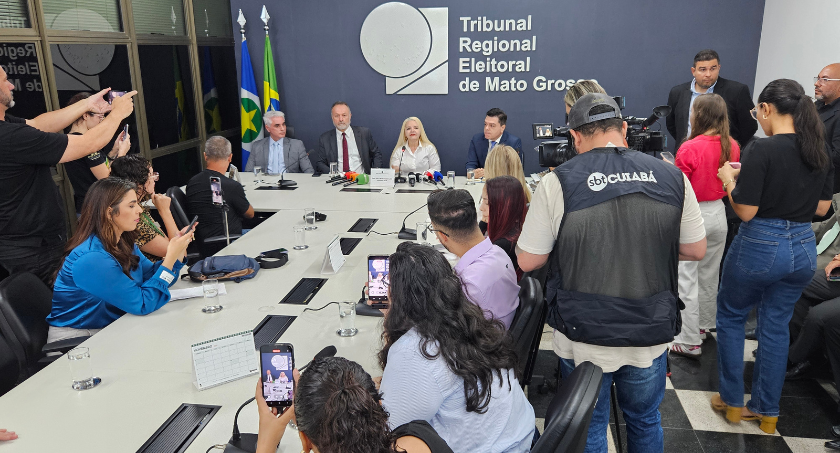 #PraTodosVerem - A imagem mostra uma coletiva de imprensa realizada na sede do Tribunal Regional Eleitoral de Mato Grosso, com autoridades sentadas à mesa principal diante de microfones e gravadores, enquanto jornalistas, cinegrafistas e repórteres os cercam, registrando a fala com câmeras, celulares e equipamentos de TV; ao fundo, aparecem o logotipo do TRE-MT e bandeiras oficiais, compondo um ambiente institucional e formal, marcado pela intensa cobertura da imprensa. Ao final da matéria, há uma galeria de fotos.