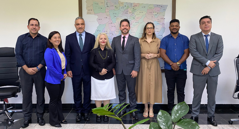 #PraTodosVerem: A imagem mostra representantes do TRE-MT e da Câmara de Cuiabá reunidos em torno de uma mesa. Há documentos e itens de papelaria espalhados por ela. Ao fundo, é possível ver um grande mapa do estado de Mato Grosso. No final da matéria, há uma galeria de fotos.