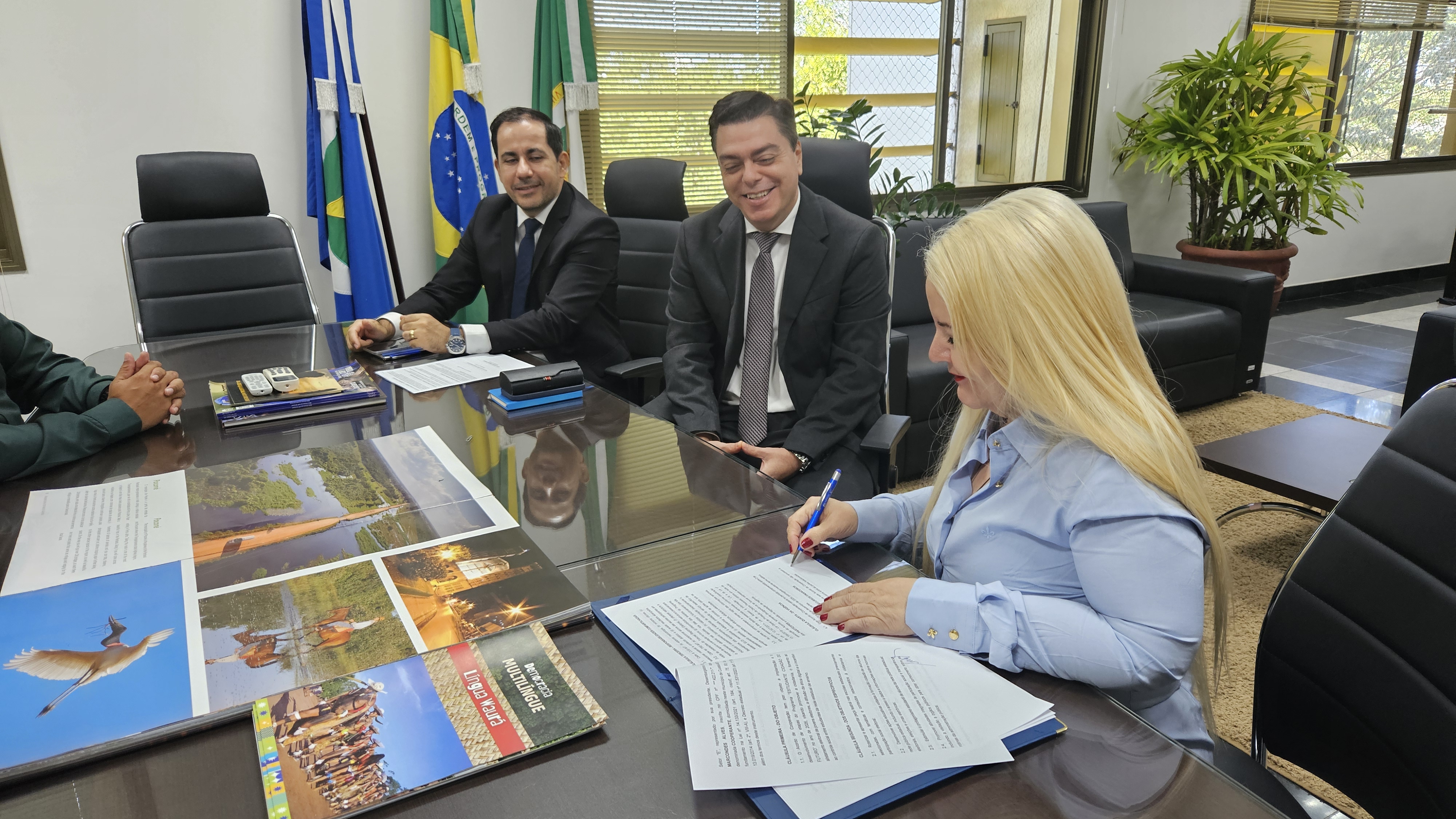 Também participaram do ato de formalização da parceria, o diretor-geral do TRE-MT, Mauro Sérgio Rodrigues Diogo, o assessor jurídico Hernandesio de Lima; a assessora da Presidência, Sueli Sanae Shimada Ueda; o assessor de Comunicação, Daniel Dino; e a secretária adjunta de Ouvidoria Geral e Transparência da CGE-MT, Karen Cristina Oldoni da Silva.