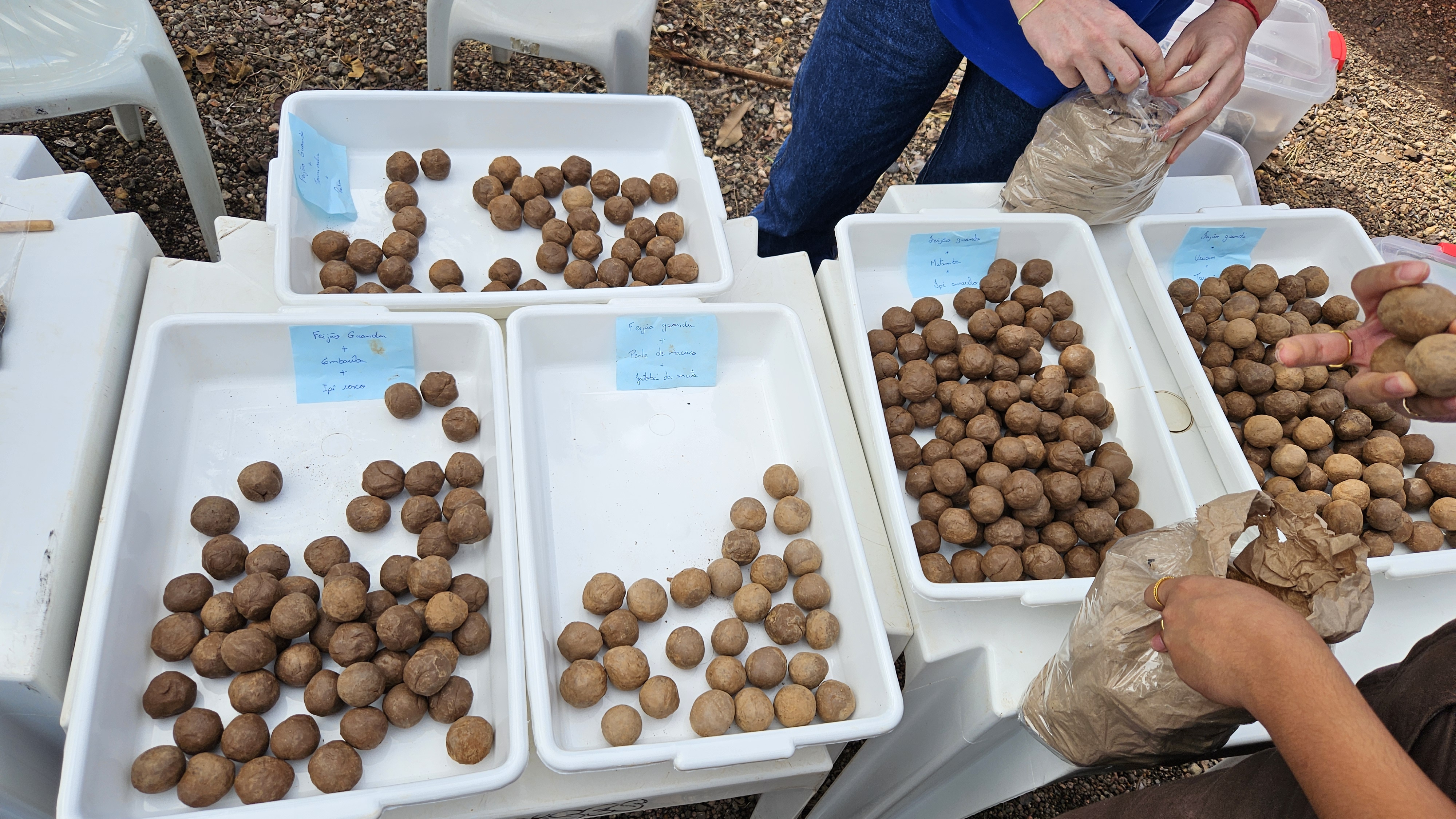 Além de serem lançadas ao solo, as bolitas foram distribuídas para a comunidade local, que é formada por 167 pessoas, tanto da zona urbana quanto da zona rural. Foram escolhidas, para esta região, sementes de espécies como ipê, angelim saia, jatobá, tarumã, entre outras.